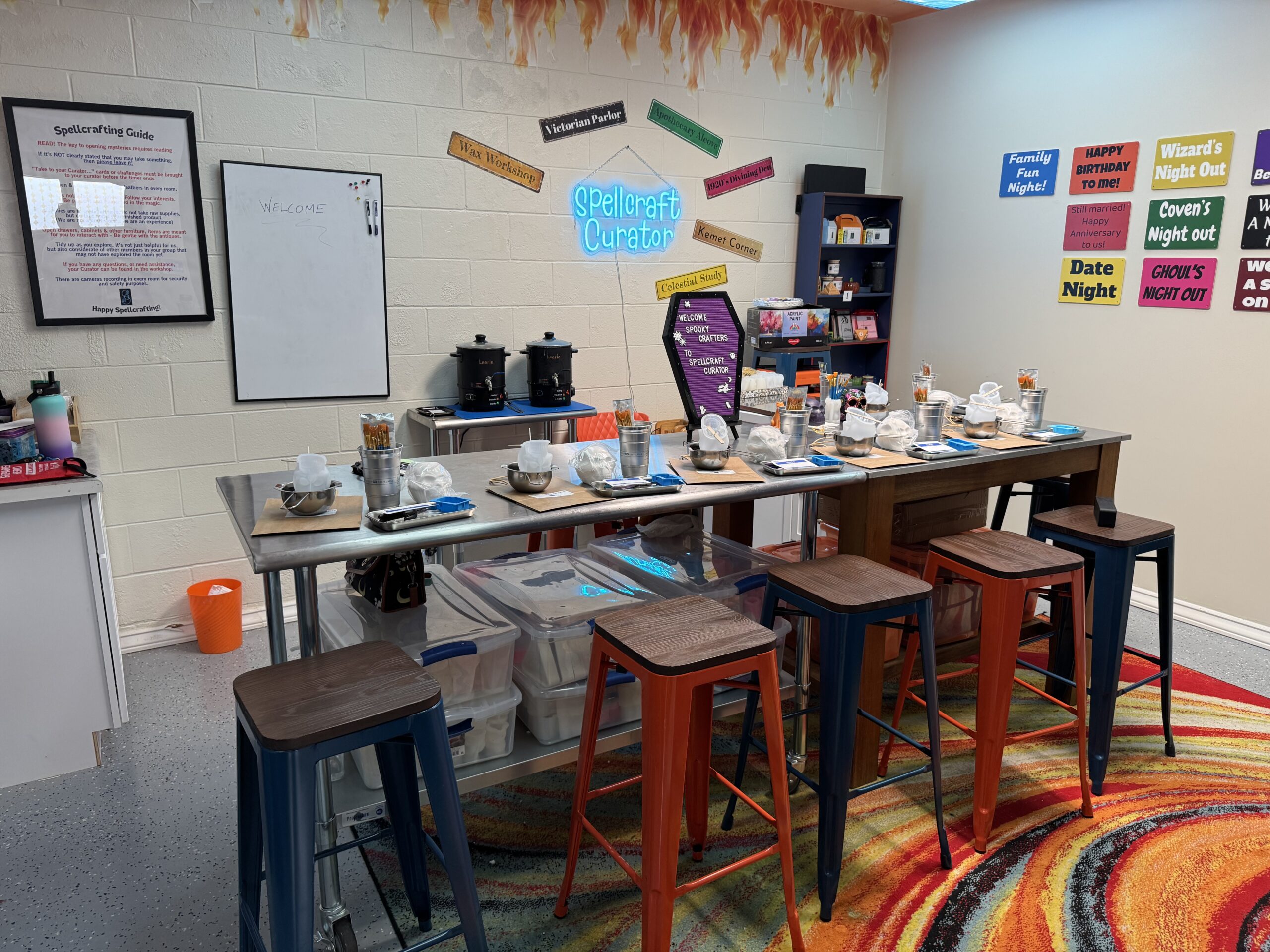 Challenges - Participate in scavenger hunts, unique challenges, decode ancient ciphers, & problem solve. Challenges and ciphers lead to delightful surprises to take home, which are made in the Spellcraft Curator Workshop. These include; spell kits, crafts kits, candles, runes, pendulums, wax melts, & more